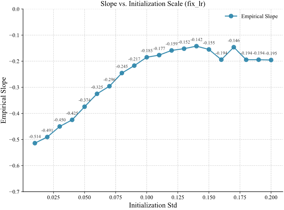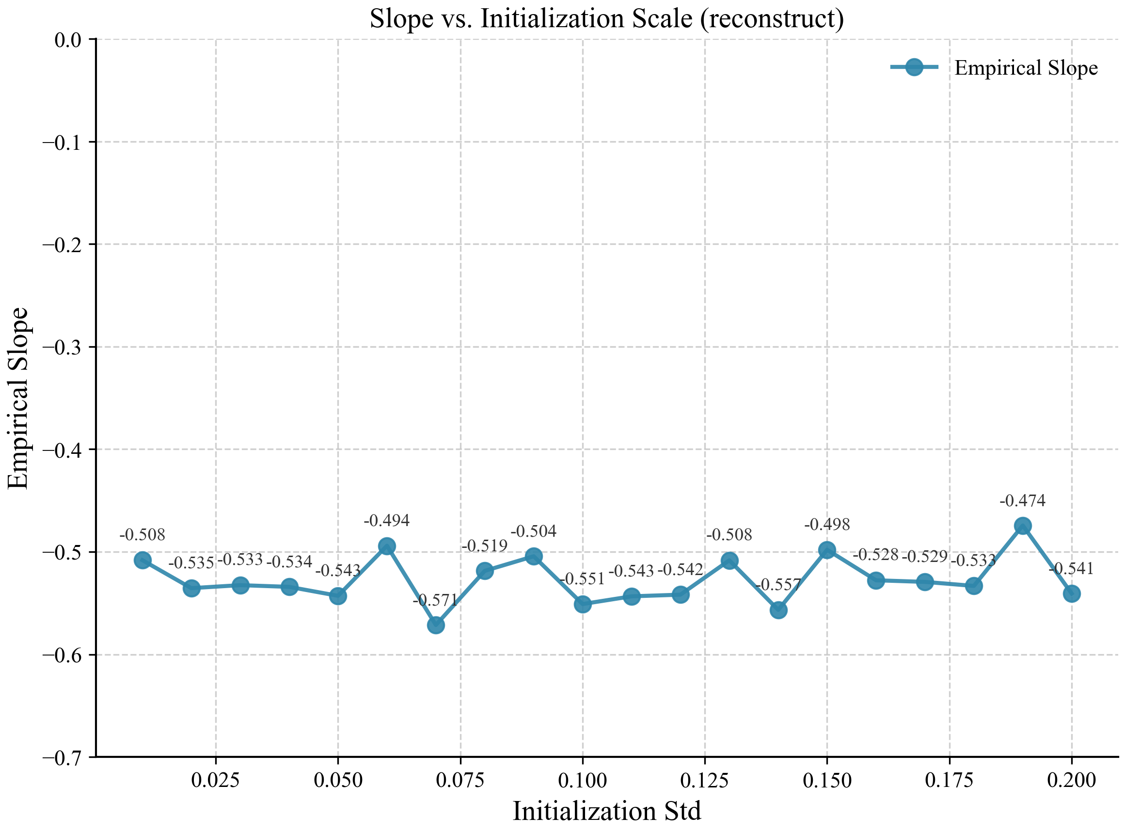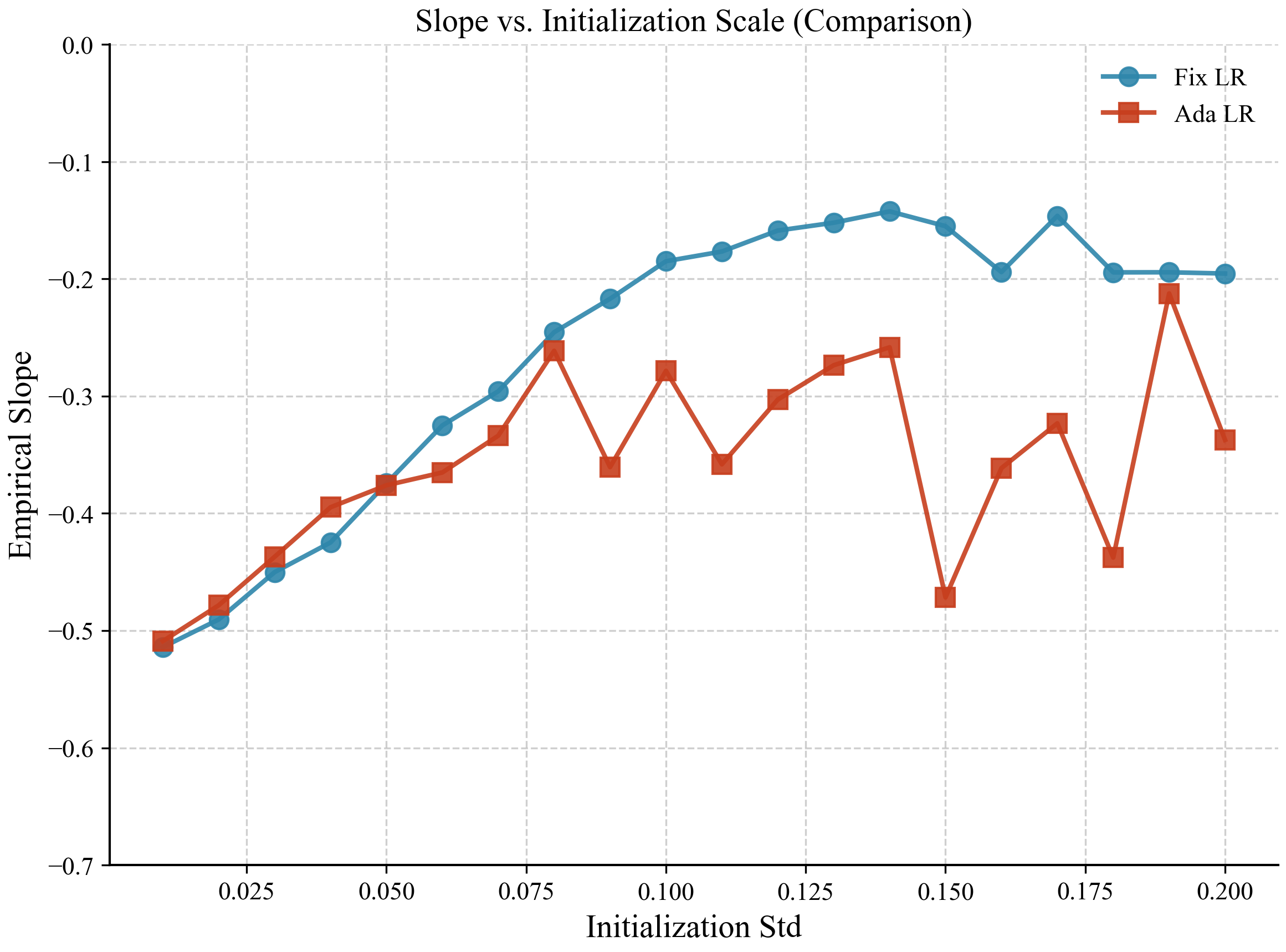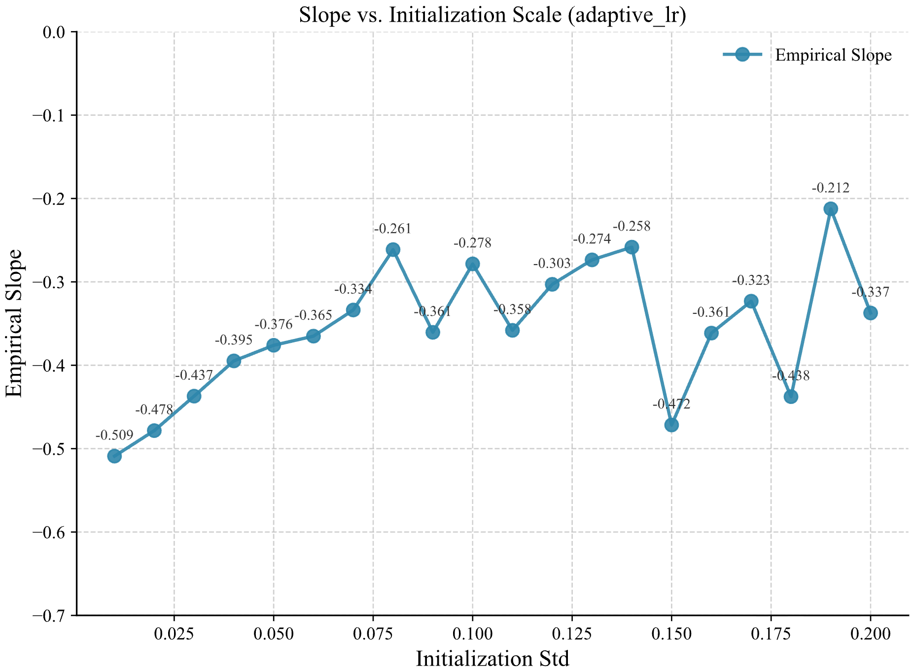 可以看见,自适应学习率 $\eta \propto \frac{1}{\sigma^2}$ 确实缓解了一点初始化 std 对 scaling 曲线 empirical slope 的影响。但在初始化 std 较小时,仍难以缓解。我认为原因可能是 \(\lVert\nabla W_2\rVert_F \approx N \sigma^3\)这个近似成立的前提需要较大的 $\sigma$(详见前文推导),所以在初始化 std 较小的情况下,$\eta \propto \frac{1}{\sigma^2}$未必正确。