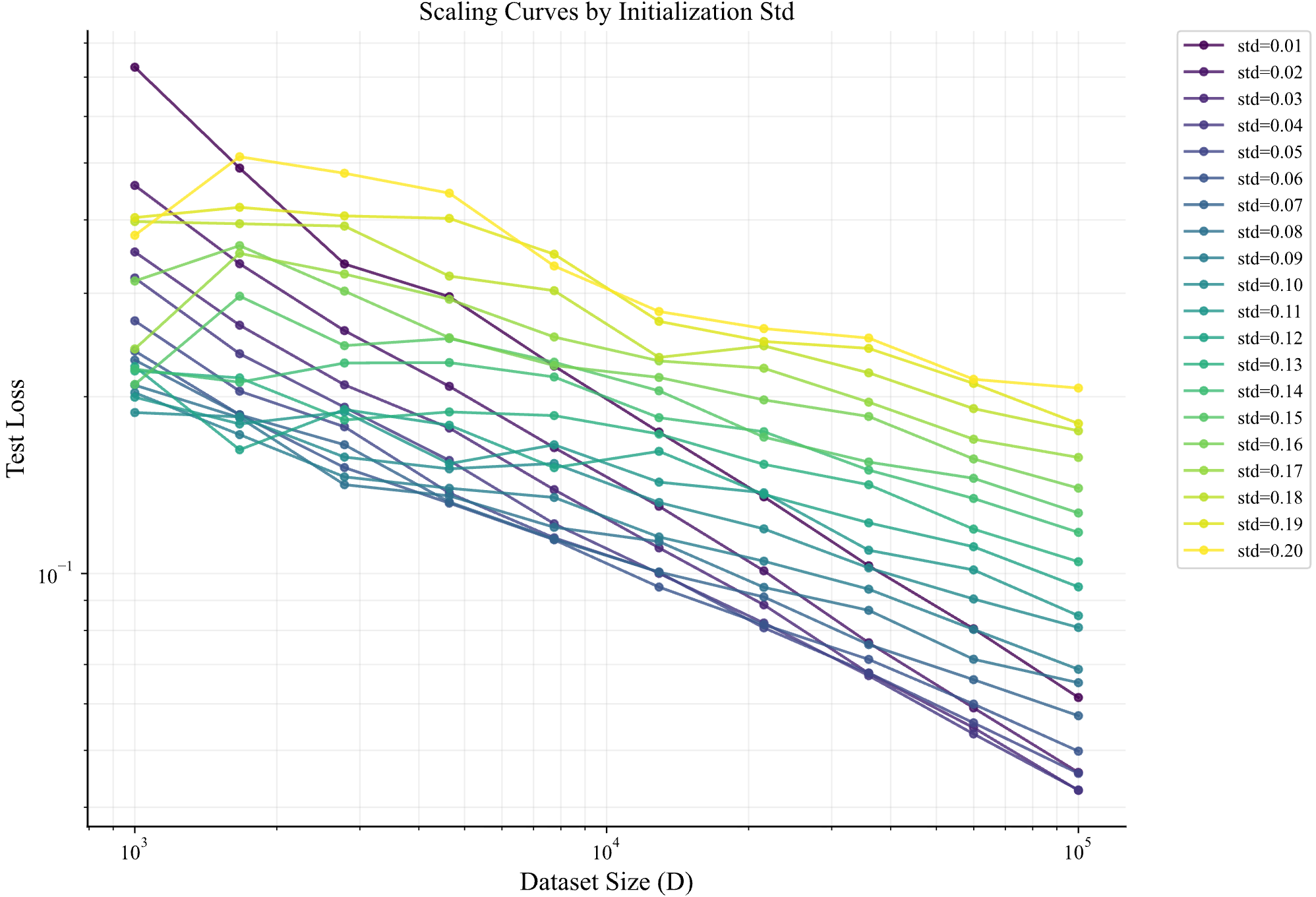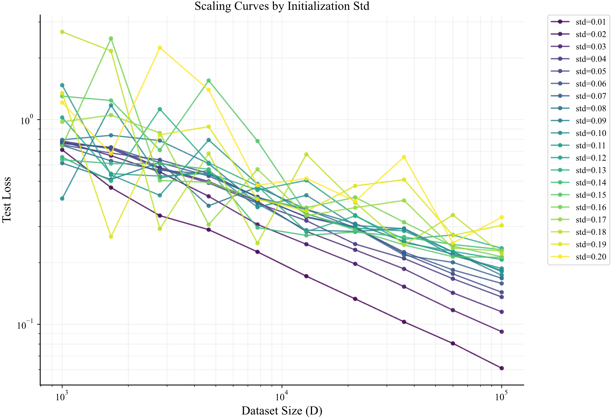 这个结果就很有趣了,可能的原因有很多,比如 std 太大导致模型进入了 lazy learning regime;或者 std 增大带来了优化过程的不稳定(这一种可能原因有待商榷,因为我测试了不同 epoch 数,结果是上图中的曲线仍能够稳定复现)。但我们可以先不考虑其诱因,先来考虑如何对齐不同初始化大小下的 data scaling 曲线。