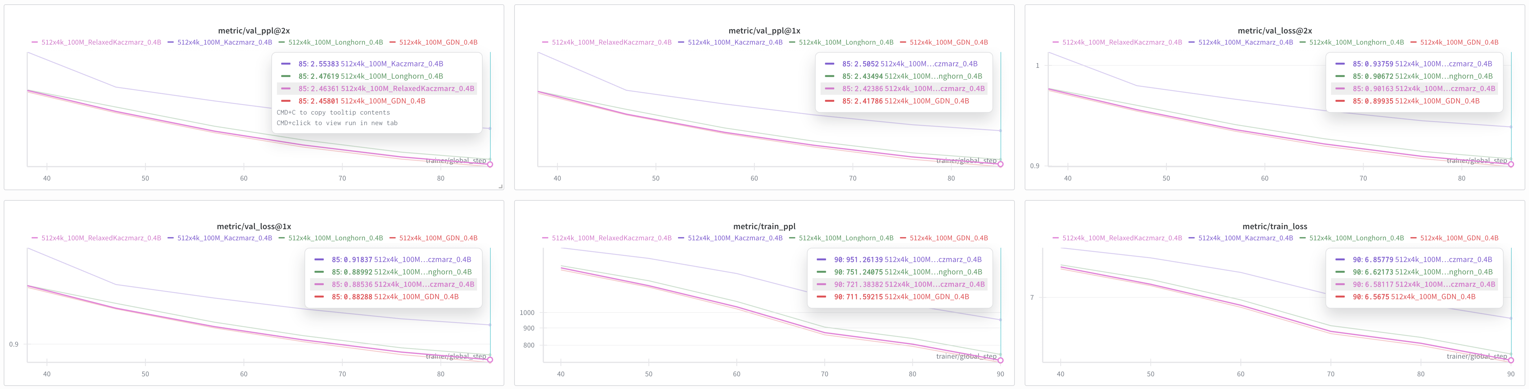 我们在 SlimPajama 数据集上训练了 1 亿个 token,并在验证集上绘制了困惑度(ppl)与 Loss 随 token horizon 变化的曲线。图中 @1x 与 @2x 分别对应序列长度 2048 与 4096 的评估结果。若 Longhorn 可视为 Kaczmarz 的某种形式,则 Relaxed Kaczmarz 理应更优,实验亦证实了这一点。